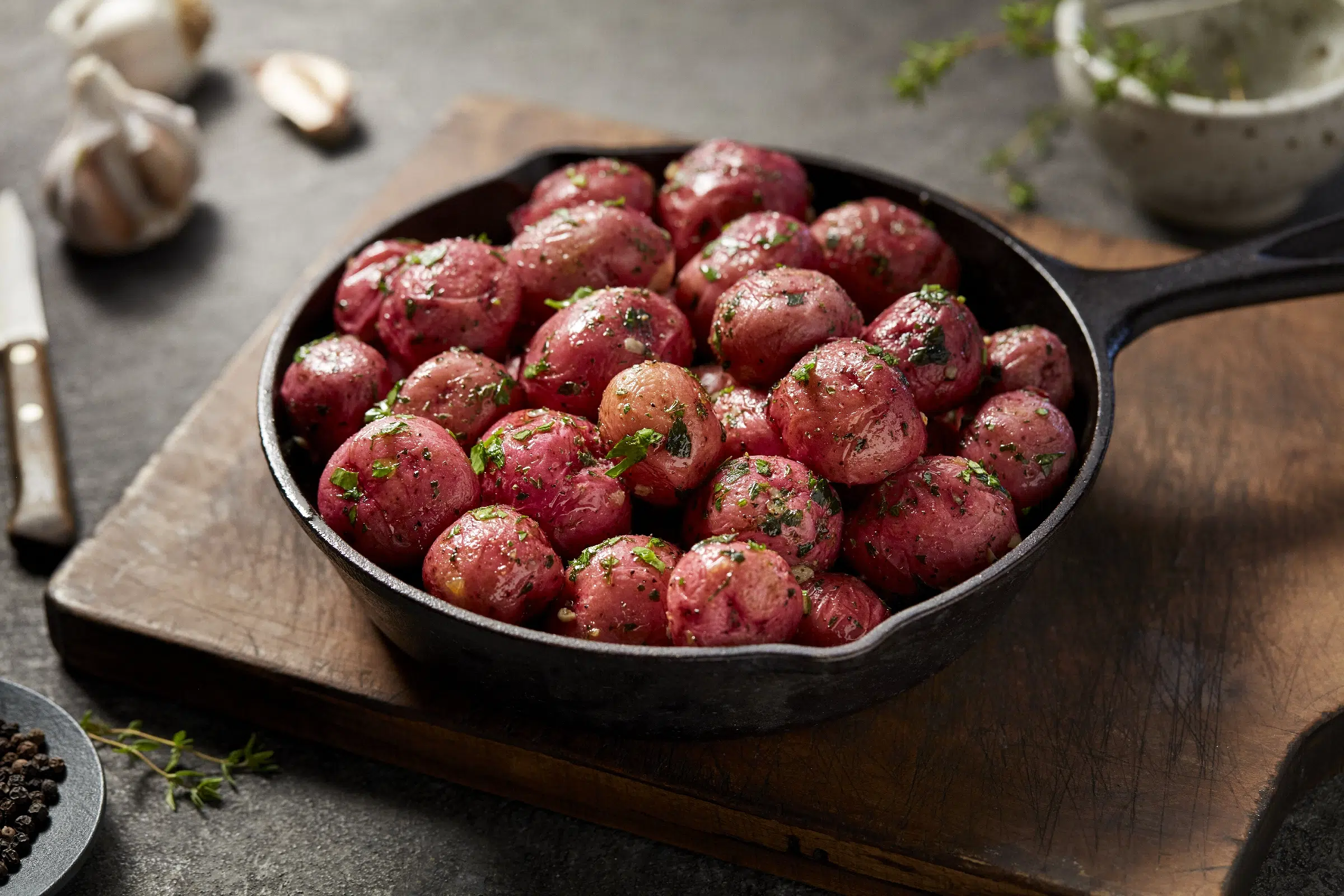 These red potatoes come pre-cut and seasoned to perfection, ready to elevate your menu in minutes. They’re tossed in a robust blend of canola and extra virgin olive oil, infused with aromatic garlic and parsley, and kissed with a touch of our secret spice.