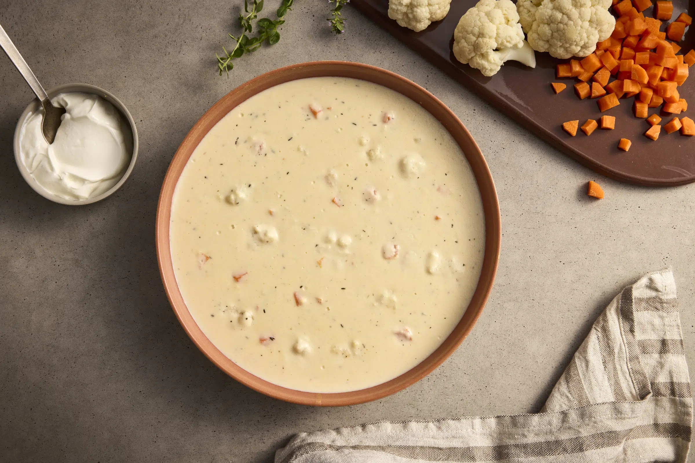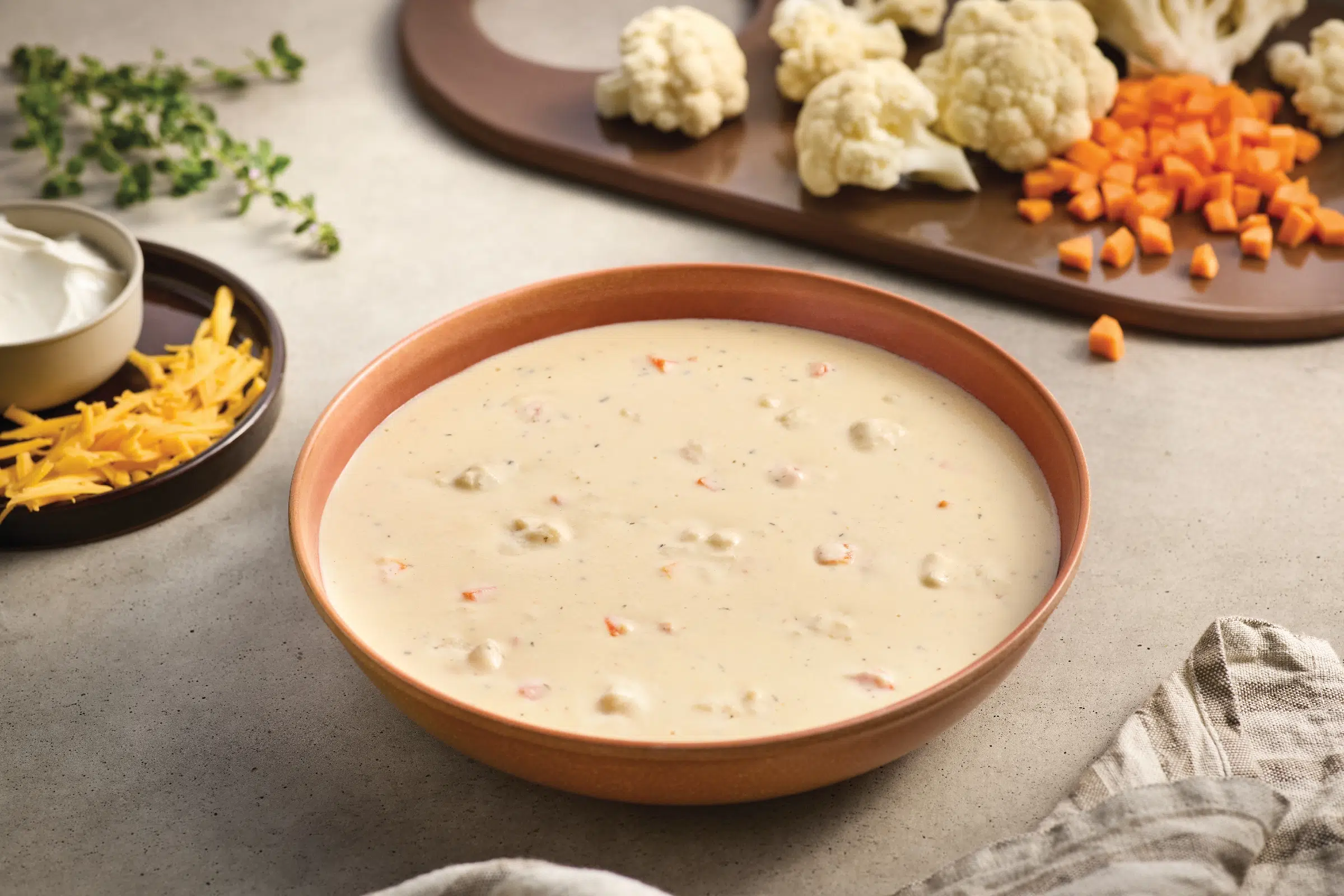 WATER, CAULIFLOWER, CREAM CHEESE (CULTURED MILK AND CREAM, SALT, STABILIZERS [GUAR GUM, CAROB BEAN GUM]), SOUR CREAM (CULTURED MILK AND CREAM), MILK (MILK, VITAMIN D3 ADDED), CARROTS, CHEDDAR CHEESE (MILK, CULTURE, SALT, ENZYMES, ANNATTO [COLOR], ANTI-CAKING BLEND [POTATO STARCH, POWDERED CELLULOSE]), ONIONS, CONTAINS LESS THAN 2% OF BUTTER (CREAM, NATURAL FLAVORINGS), GARLIC, MODIFIED CORN STARCH, CHEDDAR CHEESE BASE (CHEESE [{MILK, CULTURE, SALT, ENZYMES}, WATER, SODIUM PHOSPHATE, ENZYMES], SALT, YEAST EXTRACT, CORN OIL, CREAM, BUTTER [CREAM, NATURAL FLAVORING], WHEY, SUGAR, MUSTARD SEED, NATURAL FLAVOR), SALT, VEGETARIAN CHICKEN FLAVORED BASE (MIREPOIX [ONION, CARROT, CELERY], SALT, SUGAR, MALTODEXTRIN, YEAST EXTRACT, CORN STARCH, GARLIC POWDER, TURMERIC, NATURAL FLAVORS), DEHYDRATED GARLIC, SPICES, SODIUM CITRATE, NISIN PREPARATION (SALT, NISIN [PRESERVATIVE]), XANTHAN GUM.